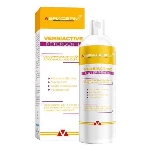 BRADERM VERSIACTIVE Detergente corpo Descrizione Detergente per il corpo ad alta tollerabilità particolarmente adatto nella seborrea e nel prurito con azione idratante e purificante. Contribuisce a ripristinare il film idrolipidico, i valori fisiologici della cute e la normalizzazione del turnover cellulare. Grazie alla presenza di funzioni quali Ciclopirox Olamina, climbazolo, acido salicilico e Tea Tree Oil, garantisce un’azione sebo equilibrante, favorendo sia la normalizzazione dell’eccessiva desquamazione cutanea sia proteggendo dalle alterazione della flora microbica cutanea. La formulazione attenua la fastidiosa sensazione di pruri...
