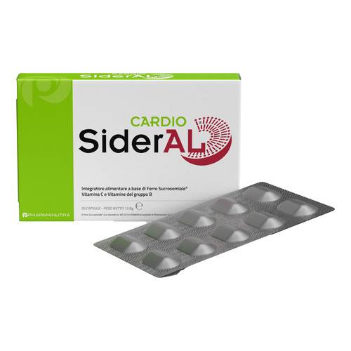 CARDIO SiderALDescrizione Integratore alimentare a base di Ferro Sucrosomiale, vitamina C e vitamine del gruppo B utile per colmare le carenze alimentari o gli aumentati fabbisogni organici di questi nutrienti. Il ferro contribuisce alla normale formazione dei globuli rossi e dell'emoglobina. Le vitamine B6 e B12 contribuiscono alla normale formazione dei globuli rossi. Le vitamine B6, B12 e acido folico contribuiscono al normale metabolismo dell'omocisteina. Ingredienti Ferro, vitamina C, vitamina B6, vitamina B12, acido folico. Senza glutine. Caratteristiche nutrizionali Contenuti medi per 1 capsula Ferro 30 mg Vit...