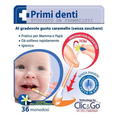 Primi denti Al gradevole gusto caramello (senza zucchero) • Pratico per Mamma e Papà • Dà sollievo rapidamente • Igienico SENZA PARABENI Presentazione Clic&Go è una gamma di applicatori monodose che hanno il vantaggio di essere: • pronti all 'uso, rapidi e pratici, semplificano i gesti quotidiani. Basta cliccare per far scendere la soluzione sul cotone. • Dispositivi monouso a garanzia della protezione contro le contaminazioni e per una conservazione ottimale della soluzione attiva contenuta. • Igienici e ideali per una applicazione localizzata e senza contatti con le mani. ...